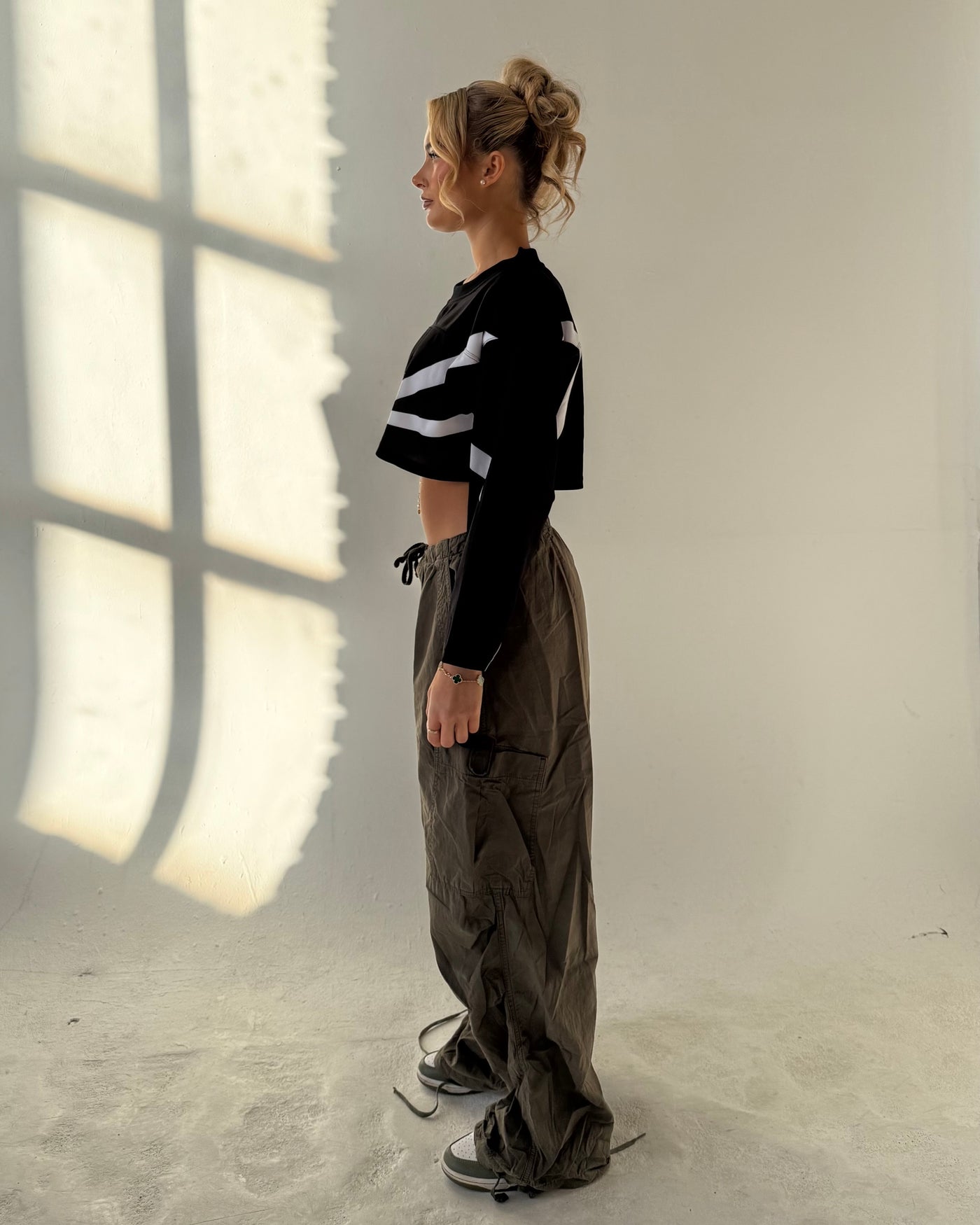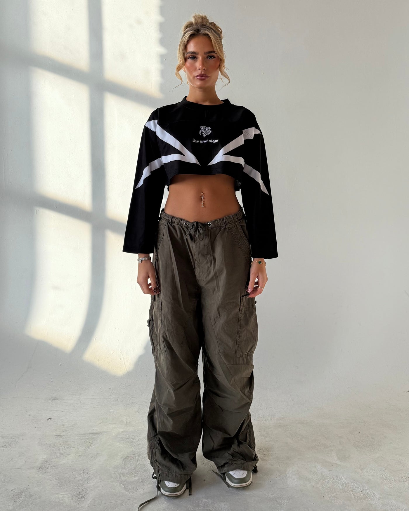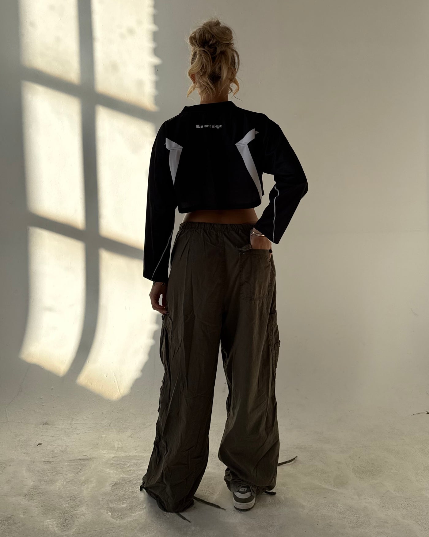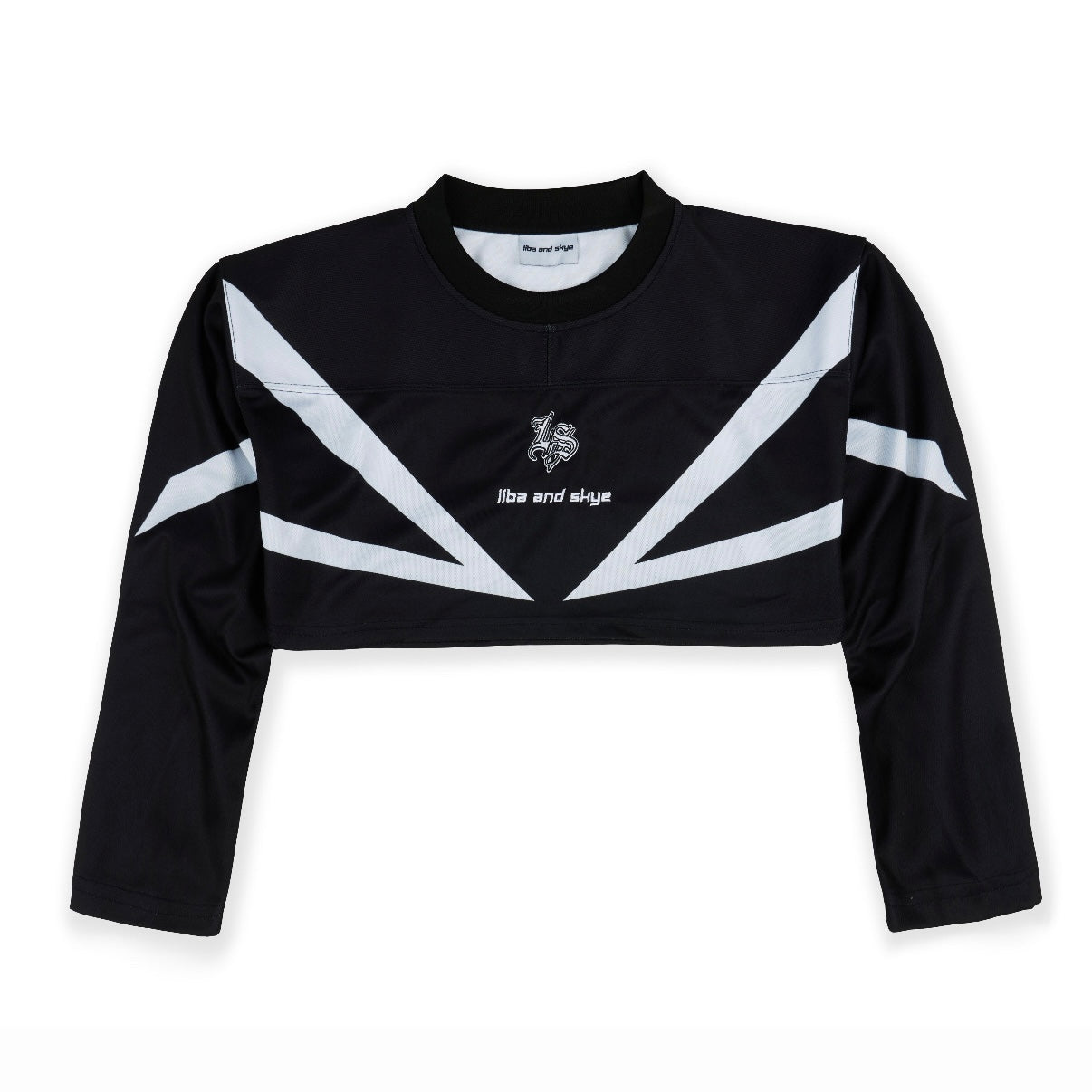 features a structured collar and cropped, oversized fit for that signature liba and skye look.