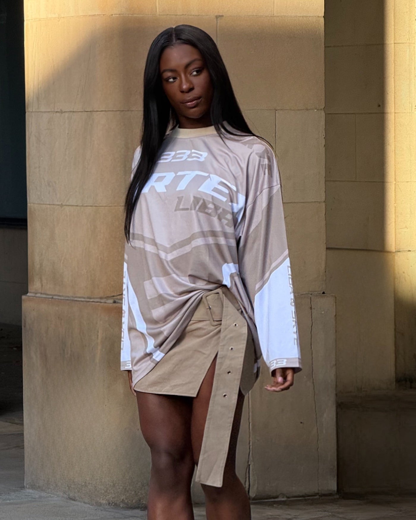 the vortex jersey has an oversized silhouette with a drop shoulder and long sleeves. it’s designed for movement, comfort, and that effortless off-duty look.