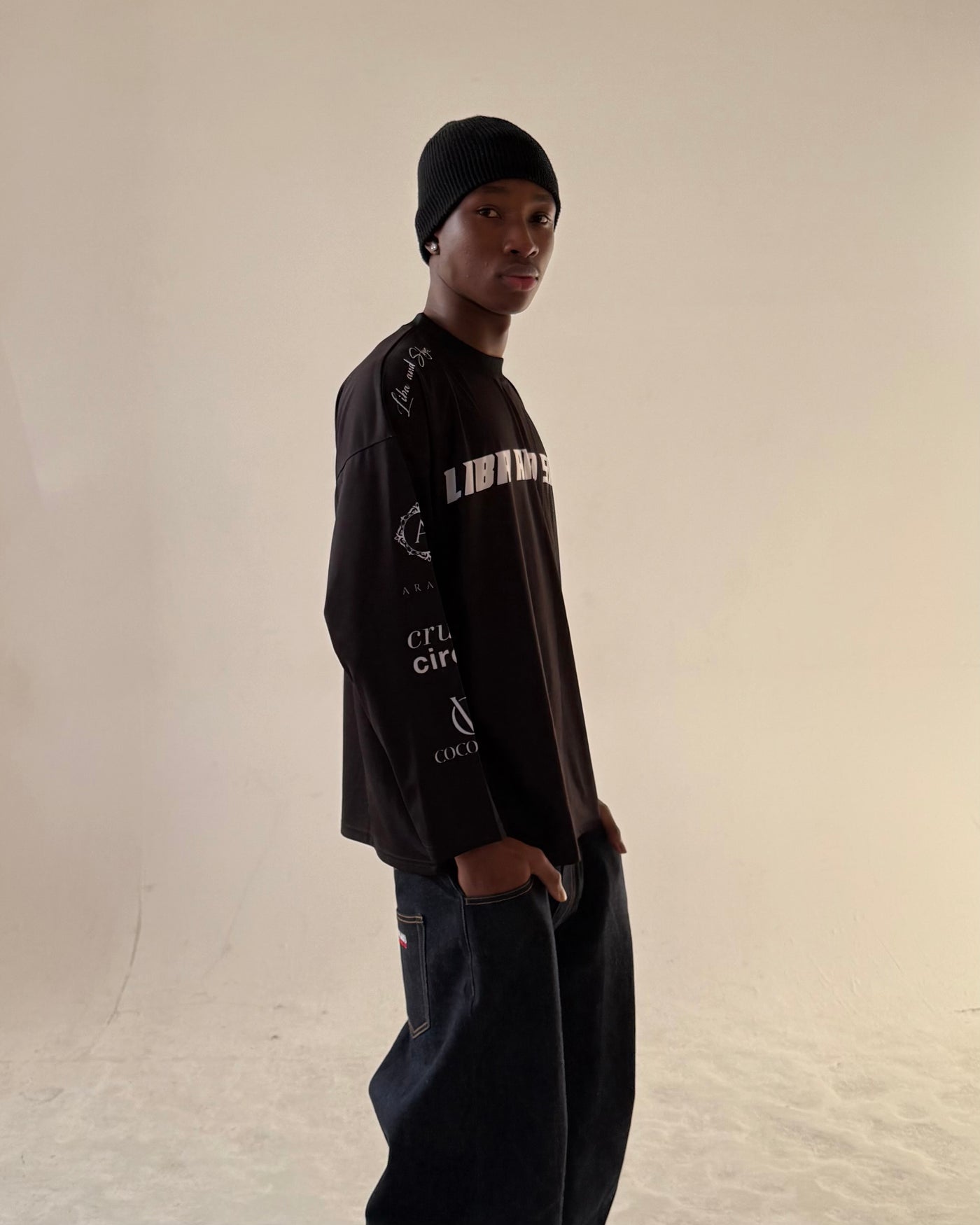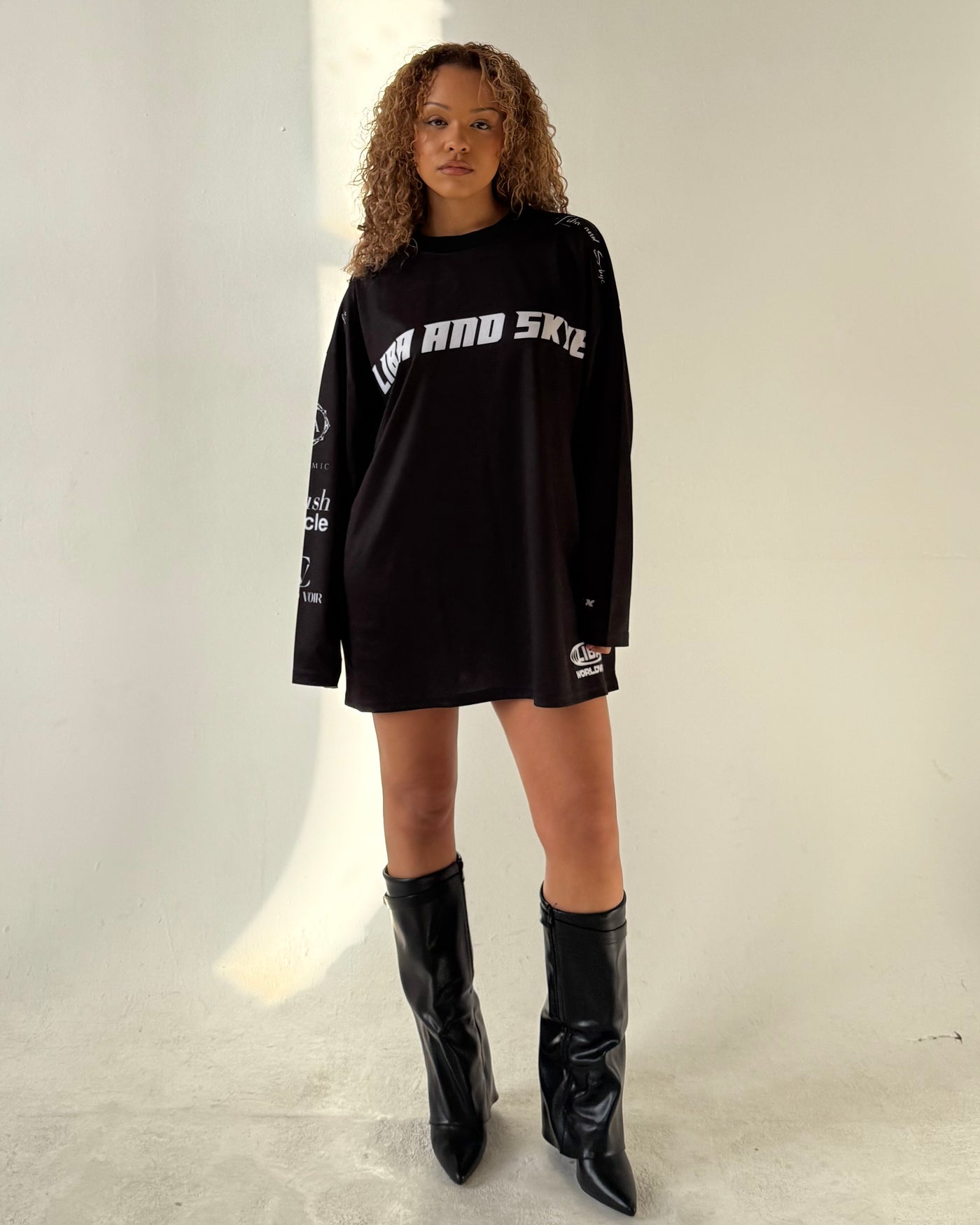the vortex jersey has an oversized silhouette with a drop shoulder and long sleeves. it’s designed for movement, comfort, and that effortless off-duty look.